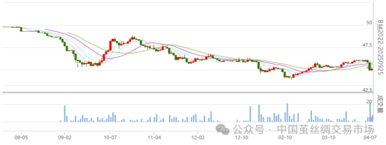 今日(2025年04月08日,周二)中國(guó)繭絲綢交易市場(chǎng)生絲電子指數(shù)下跌0.52%報(bào)收于4553.53點(diǎn)。B絲2022D(商檢4A級(jí)生絲):250425合約下跌0.36萬(wàn)元報(bào)收于45.54萬(wàn)元;250925合約上漲0.15萬(wàn)元報(bào)收于45.15萬(wàn)元;260325合約下跌0.03萬(wàn)元報(bào)收于45.48萬(wàn)元。