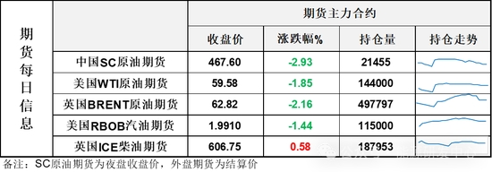 【1】WTI主力原油期貨收跌1.12美元,跌幅1.85%,報59.58美元/桶;布倫特主力原油期貨收跌1.39美元,跌幅2.16%,報62.82美元/桶;INE原油期貨收跌2.93%,報467.6元。