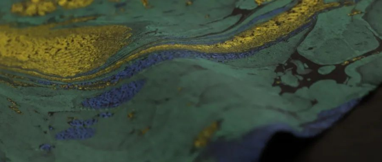 墨池香云紗的著色工藝獨(dú)特而珍惜,其著色過(guò)程依賴水的自然流動(dòng),染料在水面漂浮后附著于面料之上。每一次著色,水與染料的交融都如同一場(chǎng)無(wú)法復(fù)刻的即興創(chuàng)作,水流的速度、方向,染料的擴(kuò)散程度,皆存在細(xì)微差異,致使每次掛染出的顏色與圖案都獨(dú)一無(wú)二。