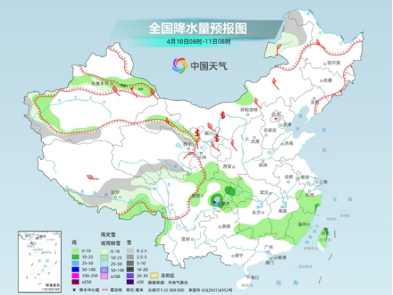 具體來(lái)看,今天,新疆沿天山地區(qū)和南疆盆地、青海南部、甘肅河西、內(nèi)蒙古東北部、西藏東部和南部、川西高原北部等地部分地區(qū)有小雪或雨夾雪。陜西南部、四川東北部、重慶、浙江中南部、湖南南部、江西中南部、福建等地部分地區(qū)有小到中雨,其中,重慶西南部局地有大雨。