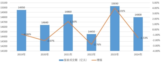根據(jù)中國紡聯(lián)流通分會對全國萬平米以上服裝專業(yè)市場測算,2024年,我國紡織服裝專業(yè)市場總成交額為23600億元,其中,專業(yè)市場渠道服裝總成交額(含批發(fā)零售)為14800億元,同比下降1.53%(圖2),占專業(yè)市場總成交額的62.71%。2019-2024年六年間,專業(yè)市場渠道服裝總成交額基本保持在1.4萬億-1.5萬億之間,總量規(guī)模基本穩(wěn)定,但供貨渠道結(jié)構(gòu)發(fā)生了深刻變化。