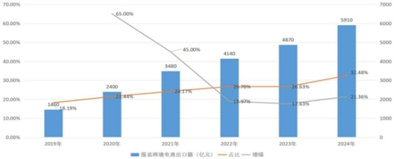 中國紡聯(lián)流通分會測算,2024年,我國服裝跨境電商出口額為5910億元,增幅為21.36%;2019-2024年,我國服裝跨境電商出口額實現(xiàn)了跨越式增長,服裝在我國跨境電商出口金額的占比也從2019年的18.19%進(jìn)一步提高到2024年的32.48%,服裝品類影響力明顯提升(圖4)。