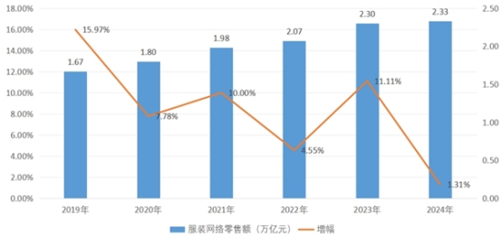 2019-2024年,我國服裝(B2C)網(wǎng)絡(luò)零售額從1.67萬億元增長到2.33萬億元,年度同比增幅由2019年15.97%的高速增長轉(zhuǎn)為5%以下的中低速增長。