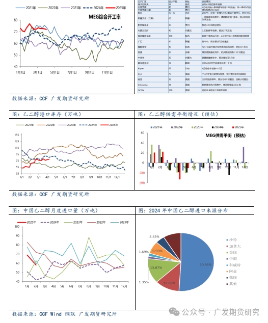 另外,國(guó)務(wù)院關(guān)稅稅則委員會(huì)4月9日發(fā)布公告,自4月10日12時(shí)01分起,對(duì)原產(chǎn)于美國(guó)的所有進(jìn)口商品的加征關(guān)稅稅率由34%提高至84%。2024年我國(guó)進(jìn)口美國(guó)乙二醇約占乙二醇總進(jìn)口量的12.5%,且我國(guó)進(jìn)口美國(guó)乙二醇的月度均值在8萬(wàn)噸附近,由于此后對(duì)美國(guó)乙二醇加征84%的關(guān)稅,因此,預(yù)計(jì)將大幅縮減美國(guó)乙二醇的進(jìn)口,乙二醇港口庫(kù)存有望去化,乙二醇總庫(kù)存4-5月去化幅度加大。