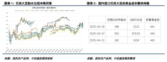 因2024/25年度巴西大豆種植成本較低,當(dāng)前售價(jià)已有相當(dāng)不錯(cuò)的種植利潤(rùn),農(nóng)戶積極的賣貨對(duì)短期貼水走勢(shì)帶來(lái)壓制,此外阿根廷新作大豆上市也帶來(lái)一定沖擊。然而,這并不意味著國(guó)內(nèi)大豆進(jìn)口成本就不具備進(jìn)一步上行空間。在中國(guó)對(duì)本次中美貿(mào)易爭(zhēng)端進(jìn)行了較充分的準(zhǔn)備及方案應(yīng)對(duì)之后,后續(xù)的中美談判進(jìn)展可能更依賴于美國(guó)的主動(dòng)妥協(xié),預(yù)計(jì)難度將有所增加,這意味著中美貿(mào)易爭(zhēng)端持續(xù)時(shí)間可能超出市場(chǎng)預(yù)期。