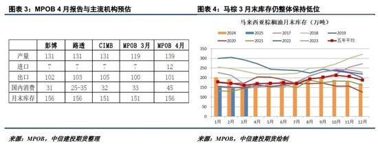 棕櫚(7878, 112.00, 1.44%)油方面,在近期價(jià)格大跌后,馬棕3月末偏低的庫(kù)存及4月改善的出口開始為價(jià)格帶來(lái)支撐。MPOB月報(bào)顯示,馬棕3月產(chǎn)量139萬(wàn)噸,環(huán)比增16.76%,高于主流機(jī)構(gòu)預(yù)估;出口101萬(wàn)噸,環(huán)比增0.91%,略低于主流機(jī)構(gòu)預(yù)估;進(jìn)口12萬(wàn)噸,國(guó)內(nèi)消費(fèi)45萬(wàn)噸,均出現(xiàn)顯著增量,這大幅減輕了產(chǎn)量高于預(yù)期帶來(lái)的累庫(kù)壓力,馬棕3月末庫(kù)存落在156萬(wàn)噸,環(huán)比小增3.52%,與主流機(jī)構(gòu)預(yù)估的151-156萬(wàn)噸基本一致。然而,盡管庫(kù)存拐點(diǎn)顯現(xiàn),馬棕依然偏低的絕對(duì)庫(kù)存仍為棕櫚油價(jià)格帶來(lái)支撐。