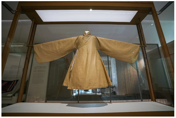 “2022年1月,南京云錦研究所承接了上海博物館的摹制任務(wù),整體項目周期耗時兩年。”項目結(jié)果得到了上海博物館及行業(yè)專家的驗收和認可,從中可看出千百年前絲織文物的原本樣貌,領(lǐng)略古人的工藝與審美。同期摹制的還有一件明代夾袍,也是由南京云錦研究所承接,陳列于展廳正入口處。
