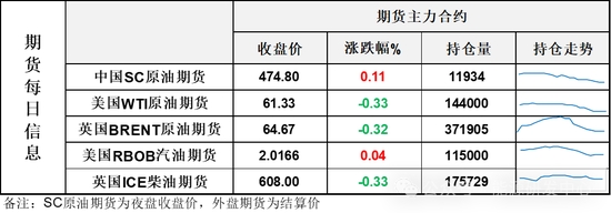 【1】WTI主力原油期貨收跌0.2美元,跌幅0.33%,報61.33美元/桶;布倫特主力原油期貨收跌0.21美元,跌幅0.32%,報64.67美元/桶;INE原油期貨收漲0.11%,報474.8元。