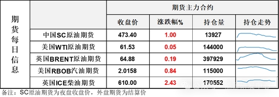 【1】WTI主力原油期貨收漲0.5美元,漲幅0.82%,報(bào)61.83美元/桶;布倫特主力原油期貨收漲1.18美元,漲幅1.82%,報(bào)65.85美元/桶;INE原油期貨收漲1.21%,報(bào)477.5元。