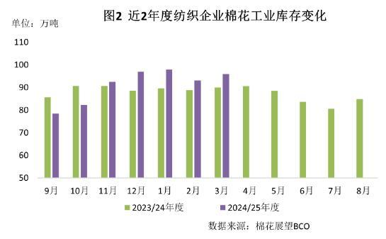 月內棉花價格處于相對低位,企業(yè)適當補庫,原料庫存穩(wěn)中有升。截至3月底,紡織企業(yè)在庫棉花工業(yè)庫存量為95.9萬噸,環(huán)比增加2.8萬噸,同比增加7.1萬噸。其中:35%的企業(yè)增加棉花庫存,27%減少庫存,38%基本保持不變。