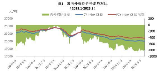 本月內外棉紗價格均價下跌,國產32支純棉紗3月均價為21010元/噸,環(huán)比下跌163元,跌幅0.8%,同比下跌2319元,跌幅10%;進口32支純棉紗3月均價21847元/噸,環(huán)比下跌121元,跌幅0.6%,同比下跌2019元,跌幅8.5%。