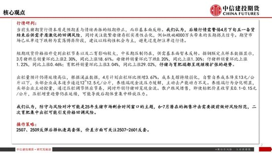 當(dāng)前生豬期貨行情本質(zhì)是預(yù)期差與情緒共振的短期修正,而非基本面反轉(zhuǎn)。我們認(rèn)為,后續(xù)行情需警惕4月下旬五一備貨結(jié)束后供需矛盾激化的回調(diào)風(fēng)險(xiǎn),同時(shí)關(guān)注能繁母豬存欄實(shí)質(zhì)性去化,例如跌破4000萬頭帶來的長(zhǎng)期拐點(diǎn)信號(hào)。期貨市場(chǎng)已從單邊下跌轉(zhuǎn)為震蕩博弈階段,建議以結(jié)構(gòu)性機(jī)會(huì)為主,避免過度押注單邊行情。
