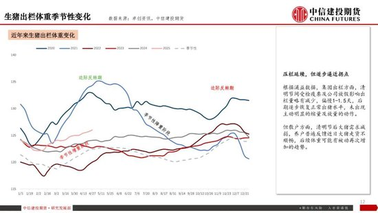 出欄量預(yù)計(jì)仍將延續(xù)高位,根據(jù)涌益數(shù)據(jù),4月計(jì)劃出欄環(huán)比預(yù)增3.67%。成本支撐持續(xù)弱化,自繁自養(yǎng)成本降至13元/公斤以下,頭部企業(yè)成本逐步逼近12~12.5元/公斤,養(yǎng)殖端現(xiàn)金流壓力緩解,主動(dòng)去產(chǎn)能動(dòng)力不足。養(yǎng)殖端行為分化明顯,頭部企業(yè)主動(dòng)控量,通過壓欄調(diào)節(jié)供應(yīng)節(jié)奏,同時(shí)外銷仔豬回籠現(xiàn)金流。散戶跟風(fēng)惜售,即使標(biāo)肥價(jià)差收窄至0.1-0.15元/公斤,壓欄增重趨勢(shì)仍在延續(xù),可能導(dǎo)致后期體重集中釋放壓力。