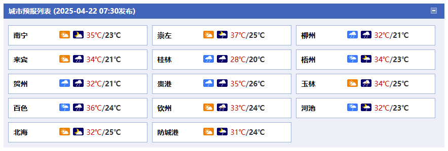 南寧市:今天白天到晚上,多云、局地有陣雨或雷雨,偏南風2到3級,最高氣溫35℃,最低氣溫23℃。