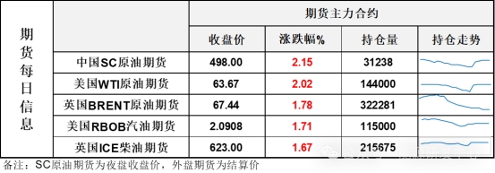 【1】WTI主力原油期貨收漲1.26美元,漲幅2.02%,報(bào)63.67美元/桶;布倫特主力原油期貨收漲1.18美元,漲幅1.78%,報(bào)67.44美元/桶;INE原油期貨收漲2.15%,報(bào)498元。