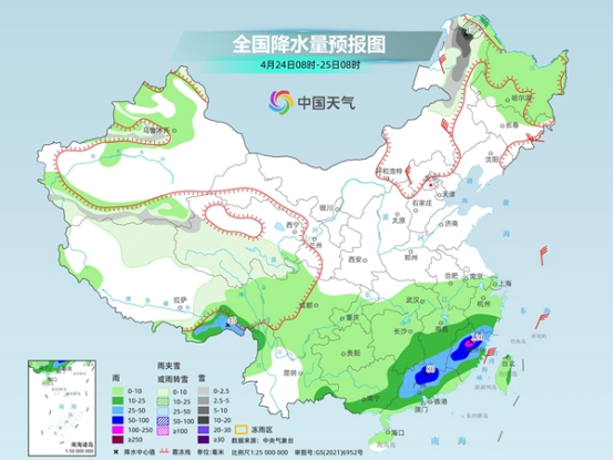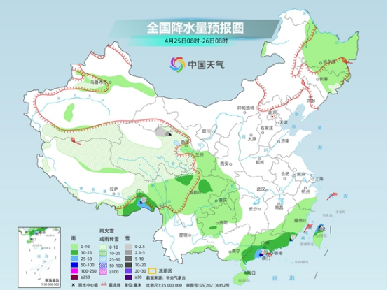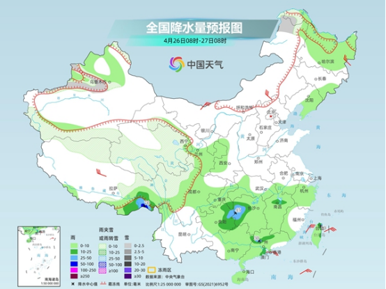 后天,內(nèi)蒙古東北部、黑龍江西北部、新疆沿天山地區(qū)和南疆山區(qū)、西藏北部、青海、甘肅中部、川西高原北部等地部分地區(qū)有小到中雪或雨夾雪。西藏東南部、湖南中西部、江西北部、貴州東部、廣東西北部等地部分地區(qū)有中到大雨,其中,西藏東南部局地有暴雨。
