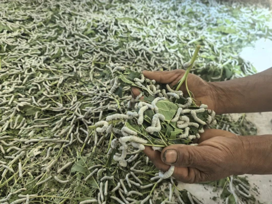 經(jīng)多方調(diào)查研究,怕秋村的氣候適宜蠶和桑樹生長(zhǎng),該村便采用“黨總支牽頭+人才加持+群眾自發(fā)參與+企業(yè)配合”的發(fā)展模式,組建由10戶群眾組成的桑蠶種養(yǎng)先鋒隊(duì)。為確保產(chǎn)業(yè)實(shí)現(xiàn)良性發(fā)展,通過開展“外出考察學(xué)習(xí)+技術(shù)人員現(xiàn)場(chǎng)教學(xué)+群眾自學(xué)”的全方位學(xué)習(xí)培訓(xùn),讓桑蠶種養(yǎng)產(chǎn)業(yè)在怕秋村落地生根。如今,怕秋村桑蠶種養(yǎng)已初見成效,成為當(dāng)?shù)厝罕娫鍪罩赂坏摹靶陆z路”。