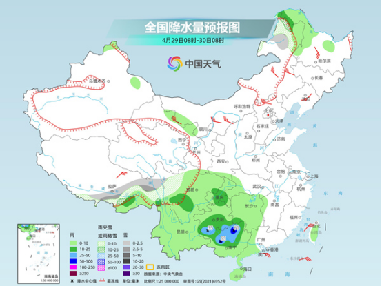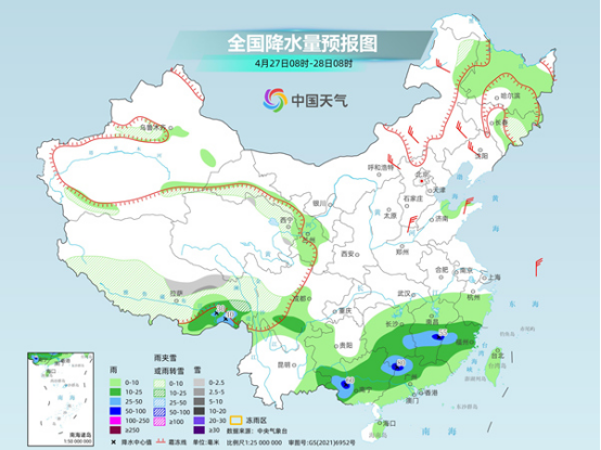 未來三天(4月27日至29日),華南降雨頻繁,其中今天和后天雨勢較強,部分地區(qū)有暴雨,并伴強對流天氣,需注意防范。氣溫方面,今天,北方多地將有降溫,之后氣溫迅速反彈。4月底至5月初,南北方多地氣溫將創(chuàng)今年以來新高。
