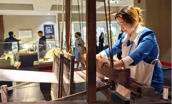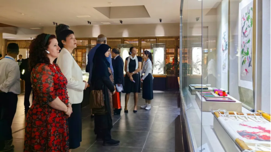 在順成公司董事長趙燕輝的陪同下,使節(jié)團(tuán)先后參觀了織綢車間、服裝車間、民族服飾博物館及蜀繪文化博物館。在織綢車間,大使們近距離觀摩了傳統(tǒng)絲綢織造工藝與現(xiàn)代智能化生產(chǎn)的融合實踐;蜀繪文化博物館內(nèi),非遺大師現(xiàn)場演示了“以綢為紙、以針為筆”的蜀繪技藝,引得使節(jié)們頻頻駐足贊嘆。隨后,旗袍定制工坊的個性化設(shè)計與精湛工藝,進(jìn)一步展現(xiàn)了中國絲綢文化的深厚底蘊與創(chuàng)新活力。參觀過程中,公司王總詳細(xì)介紹了順成公司如何通過“非遺+產(chǎn)業(yè)”模式助力鄉(xiāng)村振興,將蠶桑養(yǎng)殖、絲綢制造與文旅融合,帶動當(dāng)?shù)財?shù)千農(nóng)戶增收。