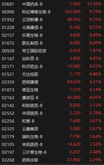 生物技術(shù)板塊持續(xù)上漲,中國抗體漲超15%,科倫博泰生物、云頂新耀漲近10%。國投證券發(fā)布研報稱,全球創(chuàng)新藥投融資環(huán)境有所復(fù)蘇,多肽、ADC等細分領(lǐng)域創(chuàng)新研發(fā)蓬勃興起,加速推動CXO行業(yè)景氣度上行,研發(fā)生產(chǎn)外包需求有望逐步改善。目前CXO上市公司相關(guān)訂單開始逐步改善且產(chǎn)能處于行業(yè)領(lǐng)先地位,看好CXO上市公司業(yè)績邊際改善。