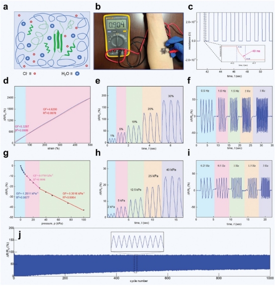 SFH具有穩(wěn)定且高的導(dǎo)電性。室溫電導(dǎo)率為3.6 S cm-1,隨絲素溶液增加而提高,打印的SFH也使皮膚表面更具導(dǎo)電性。SFH 的傳感性能通過各種應(yīng)變下相對(duì)電阻變化的可重復(fù)性來證明。SFH 的傳感性能由不同頻率下的連續(xù)應(yīng)變表示。電信號(hào)的頻率為0.5至3 Hz,覆蓋大多數(shù)人群的脈沖頻率。在連續(xù)壓縮下,電信號(hào)顯示出良好的再現(xiàn)。表明SFH 可以為應(yīng)變和壓力模型提供穩(wěn)定的電信號(hào)。