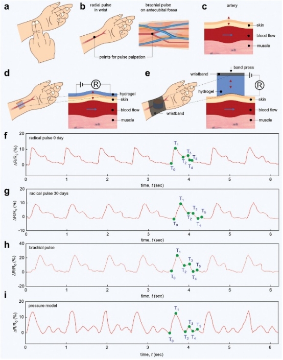 SFH可用于脈搏波形監(jiān)測(cè)。SFH被置于腕帶下,應(yīng)變傳感器記錄由于 SFH 應(yīng)變引起的電阻信號(hào),即平行于皮膚的變形。設(shè)計(jì)的應(yīng)變和壓力傳感器能高精度檢測(cè)橈動(dòng)脈和肱動(dòng)脈脈搏波形,提供一致、可靠、高精度且功能豐富的波形,如前進(jìn)波、反射波、重搏波等,以及對(duì)應(yīng)的特征點(diǎn) ,用于計(jì)算多種生理參數(shù),從而能夠?qū)ρ獕汉托难芄δ苓M(jìn)行后續(xù)分析和預(yù)測(cè)。