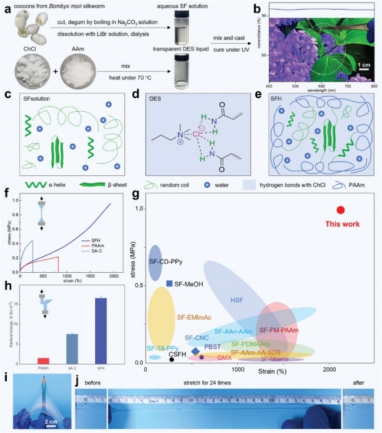 以家蠶繭絲素溶液為原料,與由氯化膽堿(ChCl)和丙烯酰胺(AAm)混合加熱制成的深共熔溶劑(DES),在光引發(fā)劑作用下經(jīng)紫外光固化,5分鐘內(nèi)可制得透明的SFH,其形狀由模具和澆筑量控制。SFH 具有良好的透明度和透射率,透射率在400至800 nm的波長范圍內(nèi)超過95%。