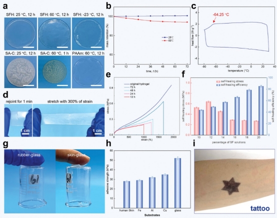 SFH具有優(yōu)異的機(jī)械性能,比較了常規(guī)多網(wǎng)絡(luò)水凝膠(由 SF 溶液、PAAm和水組成,表示為SA-C)和氫鍵增強(qiáng)的合成聚合物水凝膠(由 PAAm、ChCl和水組成,表示為PAAm水凝膠)。SFH強(qiáng)度達(dá)0.96MPa,斷裂應(yīng)變1962%,能承受4.6kg的重物,韌性為3.74MJm?3,楊氏模量0.42MPa,低于人體皮膚模量,斷裂能為16.5 kJm?2。較高濃度的SF 溶液(14%、16% 和 18%)會(huì)導(dǎo)致較低的強(qiáng)度和較高的斷裂應(yīng)變(>2000%,超出質(zhì)構(gòu)儀的應(yīng)變范圍)。選擇SFH(16% SF 溶液)并用手拉伸,可被拉伸至原始長度的24倍而不破裂,并在釋放后1分鐘內(nèi)完全恢復(fù)。