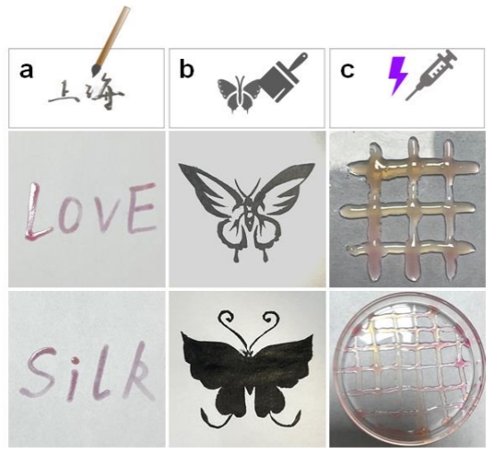 SFH具有優(yōu)異的印刷適性。SFH前驅(qū)體由于粘度低,可直接用于打印。前驅(qū)體的凝膠轉(zhuǎn)變可以很快完成,紫外光下用注射器手動(dòng)測(cè)試了擠出打印,表明SFH具有3D打印的潛力。