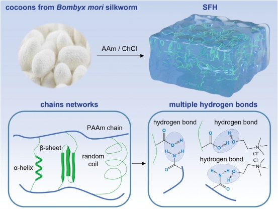 近年來,可穿戴電子設(shè)備為健康監(jiān)測(cè)帶來了新的曙光。其中,水凝膠傳感器因與生物組織相似,在實(shí)際應(yīng)用中備受關(guān)注。然而,普通水凝膠存在不少 “硬傷”,如機(jī)械強(qiáng)度差、易脫水和凍結(jié)、粘性弱、自我修復(fù)能力不足等。為了解決這些問題,研究團(tuán)隊(duì)將目光投向了絲素水凝膠(SFH)。研究人員以家蠶繭中的絲素溶液為基礎(chǔ),讓它與聚丙烯酰胺(PAAm)通過氯化膽堿(ChCl)形成鏈狀網(wǎng)絡(luò),成功制備出了性能卓越的絲素水凝膠。研究結(jié)果以“Silk Fibroin Hydrogel for Pulse Waveform Precise and Continuous Perception”為題發(fā)表在Advanced Healthcare Materials上。