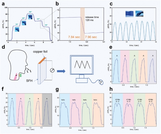 SFH傳感器具有較低的檢測(cè)限和較寬的感應(yīng)范圍,在不同的人為信號(hào)中顯示出潛力。貼在手指關(guān)節(jié)和手腕,能精準(zhǔn)監(jiān)測(cè)動(dòng)作,相對(duì)電阻變化重復(fù)精度高;作為語音傳感器,能捕捉發(fā)音時(shí)獨(dú)特的電阻信號(hào)模式,可用于語音識(shí)別。