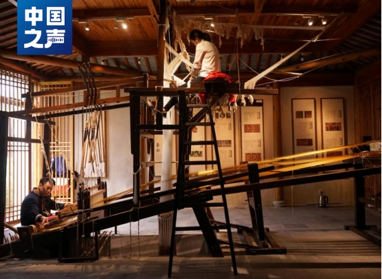 △復原的宋錦花樓織機,織造時由上下兩人共同配合,一人在上負責提花,一人坐在下面投梭織緯,兩人心手相應,默契配合,完成織造操作。