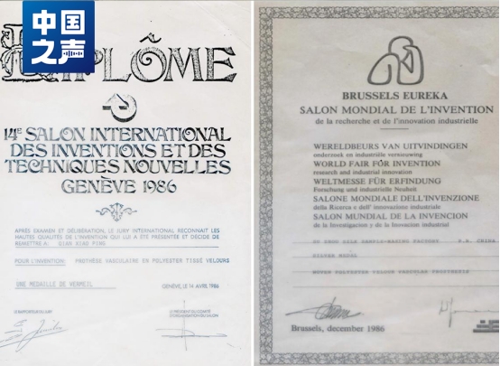 △第二代人造血管獲得多項國家和國際獎項。(左為第14屆國際發(fā)明鍍金獎,右為第35屆布魯塞爾尤里卡國際發(fā)明博覽會銀質獎。)