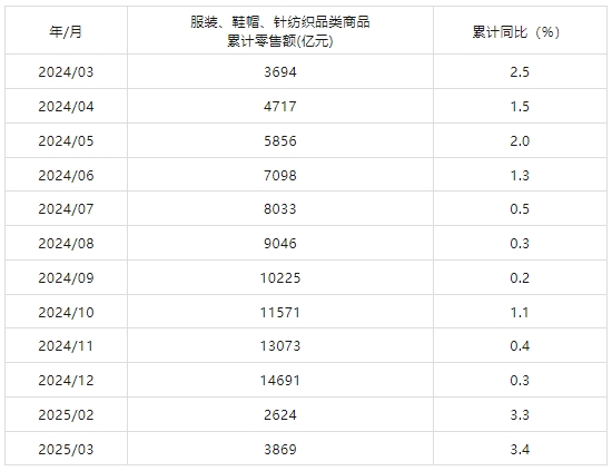 據(jù)國家統(tǒng)計(jì)局?jǐn)?shù)據(jù)統(tǒng)計(jì),2025年3月當(dāng)月紡織業(yè)增加值同比增長6.5%。服裝、鞋帽、針紡織品(含家紡類)商品零售額3869億元,同比增長3.4%。紡織業(yè)固定投資額同比增長13.5%。紡織服裝出口額662.8億美元,同比增長1%。