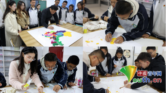 為激發(fā)學(xué)生們的愛(ài)國(guó)情懷,研支團(tuán)成員與金山實(shí)驗(yàn)學(xué)校黨員教師及學(xué)生以“增進(jìn)民族團(tuán)結(jié)”為主題共同制作了蠶繭拼畫(huà)。他們將百余枚蠶繭化作“石榴籽”,嵌入“中國(guó)地圖”“五星紅旗”等作品中,讓民族團(tuán)結(jié)的種子在青少年心中生根發(fā)芽。