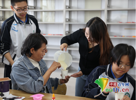 研支團(tuán)成員與金山實(shí)驗(yàn)學(xué)校師生共同制作蠶絲手工皂