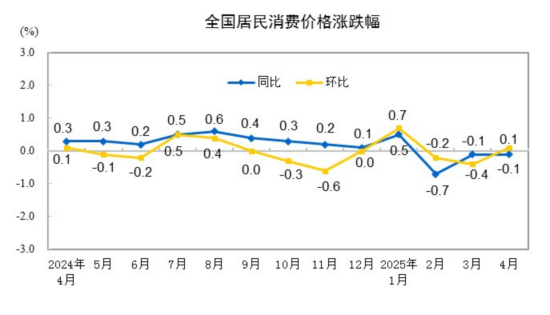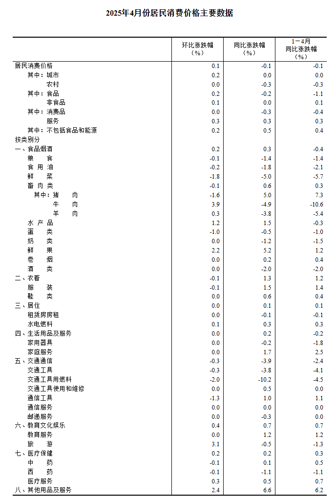 2025年4月份,全國(guó)居民消費(fèi)價(jià)格同比下降0.1%。其中,城市持平,農(nóng)村下降0.3%;食品價(jià)格下降0.2%,非食品價(jià)格持平;消費(fèi)品價(jià)格下降0.3%,服務(wù)價(jià)格上漲0.3%。1—4月平均,全國(guó)居民消費(fèi)價(jià)格比上年同期下降0.1%。