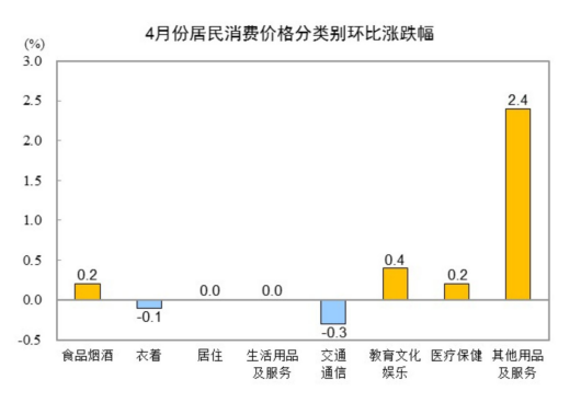 4月份,全國(guó)居民消費(fèi)價(jià)格環(huán)比上漲0.1%。其中,城市上漲0.2%,農(nóng)村持平;食品價(jià)格上漲0.2%,非食品價(jià)格上漲0.1%;消費(fèi)品價(jià)格持平,服務(wù)價(jià)格上漲0.3%。