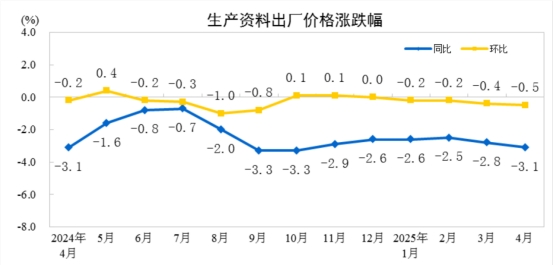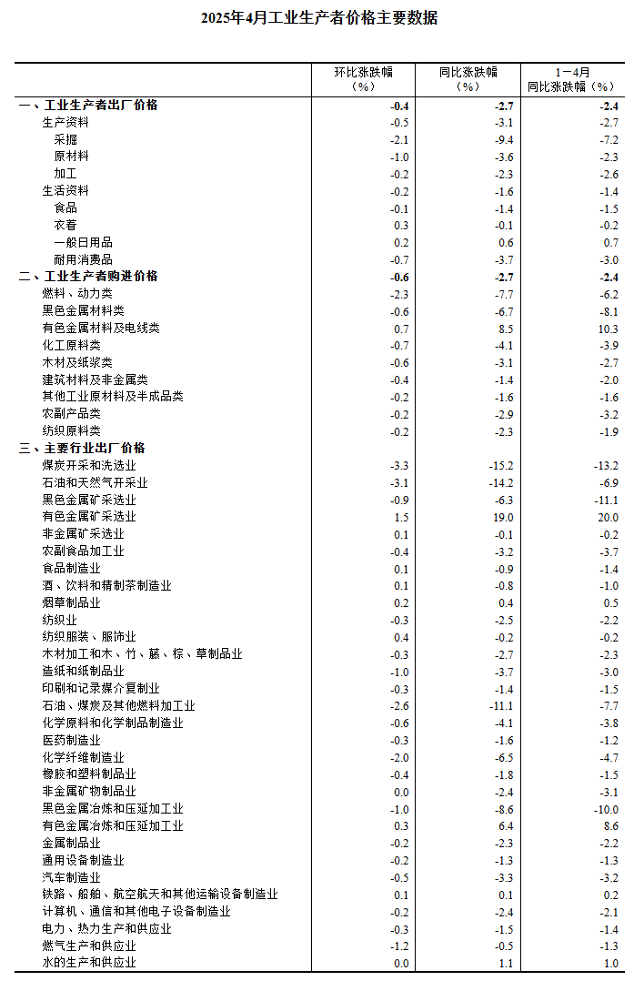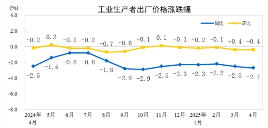 2025年4月份,全國工業(yè)生產(chǎn)者出廠價(jià)格同比下降2.7%,環(huán)比下降0.4%;工業(yè)生產(chǎn)者購進(jìn)價(jià)格同比下降2.7%,環(huán)比下降0.6%。1—4月平均,工業(yè)生產(chǎn)者出廠價(jià)格和購進(jìn)價(jià)格比上年同期均下降2.4%。