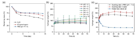 溶脹機(jī)制,水凝膠吸水能力受交聯(lián)密度和化學(xué)組成影響。PBS中離子滲透可延緩溶脹平衡,而高極性水分子加速降解。PGS水凝膠的pH響應(yīng)性與保水性能結(jié)果表明,①pH依賴性溶脹行為:溶脹率呈鐘形曲線:pH=7時(shí)達(dá)峰值(1.4),在酸堿環(huán)境中均降低;②跨生理pH穩(wěn)定性:在口腔(pH 6.6-7.1)、血液(pH 7.4)等生理環(huán)境中保持穩(wěn)定溶脹;③優(yōu)異保水能力:30小時(shí)內(nèi)快速吸水達(dá)70%飽和度,隨后保持平衡。