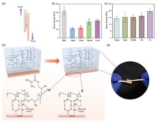 (1) 優(yōu)異的組織粘附性:PGS水凝膠對(duì)豬皮的剪切強(qiáng)度高達(dá)64kPa,遠(yuǎn)高于其他生物組織;