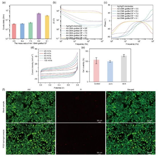 (1) 最佳導(dǎo)電配比:當(dāng)SF:PAA質(zhì)量比為8:2時(shí),電導(dǎo)率達(dá)峰值(3.2 S/m),AA增加提升載流子濃度,但過(guò)量交聯(lián)會(huì)阻礙離子遷移。