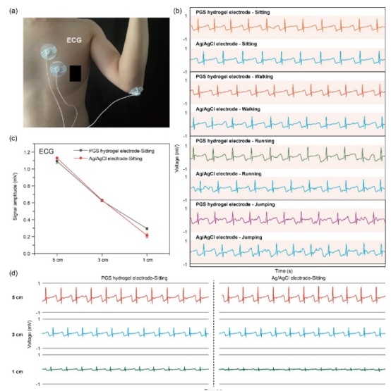 研究顯示: PGS水凝膠可在2秒內(nèi)有效密封豬胃、肺、心臟及血管(直徑5mm穿孔),阻止液體/氣體泄漏。PGS水凝膠在可穿戴領(lǐng)域具有高精度ECG監(jiān)測(cè)能力,與商用Ag/AgCl電極性能相當(dāng),清晰捕獲P-QRS-T波形。PGS水凝膠作為柔性應(yīng)變傳感器制造,以直接連接到皮膚上,以監(jiān)測(cè)各種人類活動(dòng)。結(jié)果表明PGS水凝膠具有良好的生物相容性、導(dǎo)電性、柔韌性和長(zhǎng)效粘附能力,為組織修復(fù)與智能醫(yī)療監(jiān)測(cè)提供革新性解決方案。