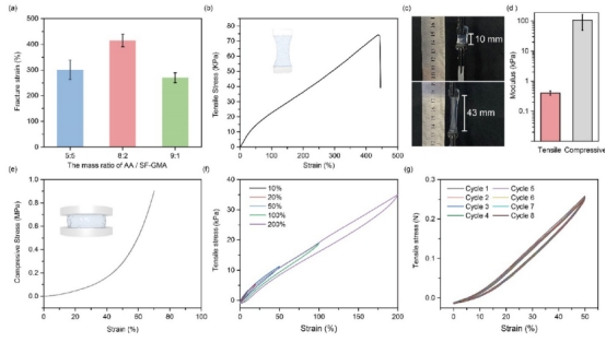通過(guò)不同配比(SF:PAA = 5:5~9:1)研究PGS水凝膠的拉伸、壓縮及斷裂特性。結(jié)果表明:①力學(xué)性能可調(diào),當(dāng)SF:PAA=7:3時(shí),斷裂強(qiáng)度最高(312 kPa);配比為8:2時(shí),拉伸應(yīng)變最大(424.6%)。②組織相容模量,拉伸模量(0.4 kPa)與壓縮模量(107 kPa)與軟組織匹配,適合生物醫(yī)學(xué)應(yīng)用。③優(yōu)異回彈性,50%應(yīng)變下幾乎無(wú)機(jī)械滯后,8次循環(huán)后強(qiáng)度保持率≈98%,歸因于PAA-SF雙網(wǎng)絡(luò)的協(xié)同作用。