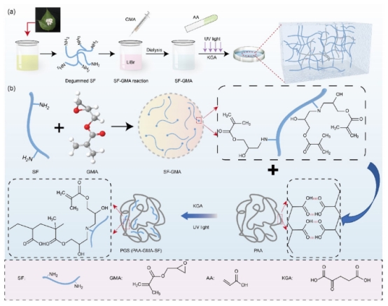 作為一種蛋白質(zhì)材料,SF具有含有活性氨基酸(-NH2)的氨基酸殘基,而甲基丙烯酸乙二酯(GMA)的環(huán)氧基群可以在SF上與氨基組形成共價(jià)鍵。這里的SF通過(guò)甲基丙烯酸酯基成功激活。其次,用GMA接枝的SF與AA(丙烯酸)的光聚合反應(yīng)。同時(shí)添加了α-酮酮谷氨酸(KGA)引發(fā)劑,以啟動(dòng)SF和AA單體上甲基丙烯酸酯基團(tuán)的自由基聚合,以形SF水凝膠。