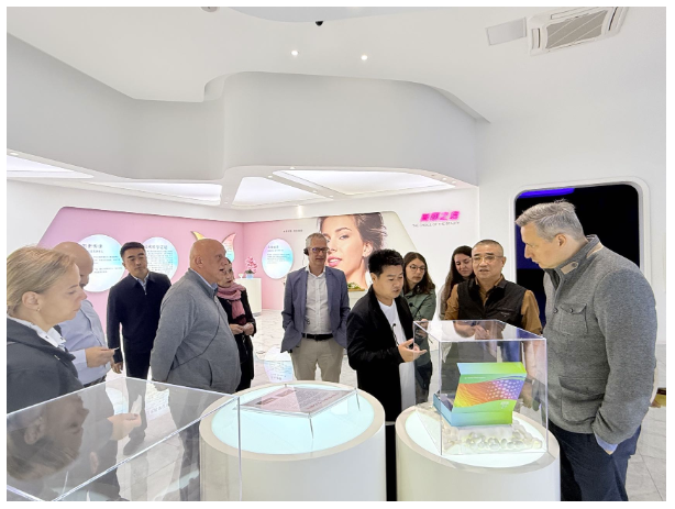 代表團一行參觀了鑫緣集團展示中心,邊走邊看,頻頻點頭,鑫緣集團黨委書記、董事長、總經理儲呈平詳細介紹了繭絲綢產業(yè)助農增收以及產業(yè)最新發(fā)展趨勢等情況。海安白廠絲綠色有機,是高品位原料,備受歐洲客商青睞。