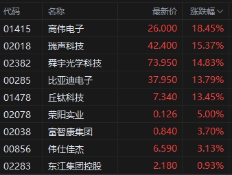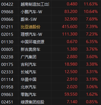 5月12日消息,港股三大指數(shù)尾盤沖高,截至收盤,恒生指數(shù)(23549.459, 681.72, 2.98%)漲2.98%,報23549.46點,恒生科技指數(shù)(5447.35, 267.10, 5.16%)漲5.16%,國企指數(shù)漲3.01%。盤面上,科網(wǎng)股集體爆發(fā),聯(lián)想集團(10.18, 0.89, 9.58%)漲超9%,京東集團、嗶哩嗶哩、阿里巴巴、快手漲超6%,百度集團漲超5%;蘋果概念股集體飆漲,高偉電子(26, 4.05, 18.45%)漲超18%;汽車股普遍大漲,小鵬汽車漲超10%;航運及港口板塊齊漲,中遠海控(13.5, 1.06, 8.52%)漲超8%。