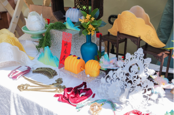 今年的“解鎖非遺沖沖沖”游園打卡游戲中融入了非遺技藝,玩家通過體驗(yàn)“清水絲綿”剝繭技藝、繅絲以及織布,了解絲綢從蠶繭到織造的過程。這一活動不僅增加了觀眾的參與感與趣味性,也加深了大家對中國蠶桑絲織技藝的了解。園區(qū)的非遺主題集市商品琳瑯滿目,漢服、絨花、絲網(wǎng)花、布料、首飾……來往的行人絡(luò)繹不絕,駐足挑選自己喜愛的物件。