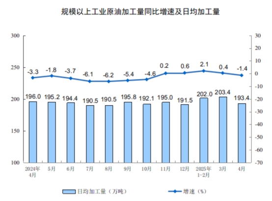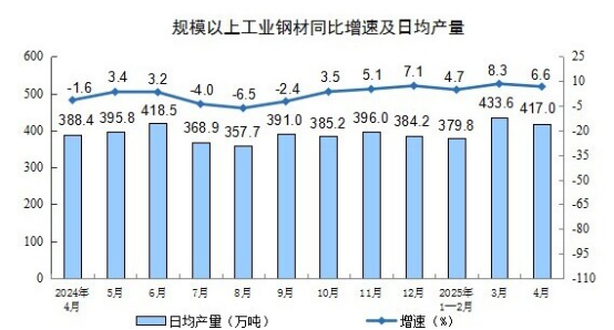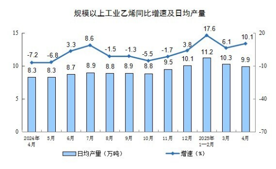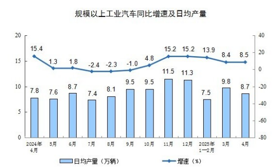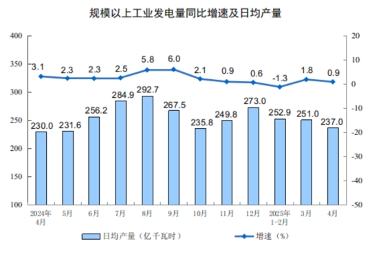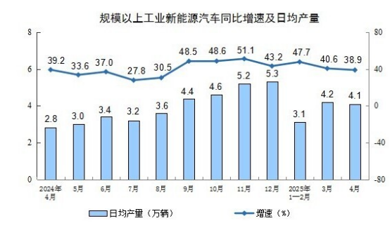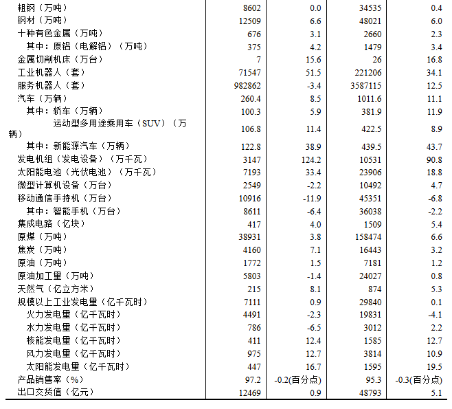 分產(chǎn)品看,4月份,規(guī)模以上工業(yè)623種產(chǎn)品中有341種產(chǎn)品產(chǎn)量同比增長(zhǎng)。其中,鋼材12509萬(wàn)噸,同比增長(zhǎng)6.6%;水泥16530萬(wàn)噸,下降5.3%;十種有色金屬676萬(wàn)噸,增長(zhǎng)3.1%;乙烯298萬(wàn)噸,增長(zhǎng)10.1%;汽車260.4萬(wàn)輛,增長(zhǎng)8.5%,其中新能源汽車122.8萬(wàn)輛,增長(zhǎng)38.9%;發(fā)電量7111億千瓦時(shí),增長(zhǎng)0.9%;原油加工量5803萬(wàn)噸,下降1.4%。