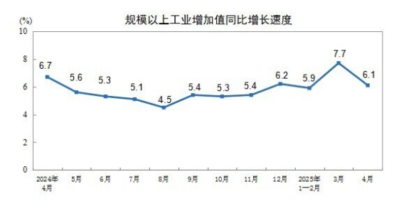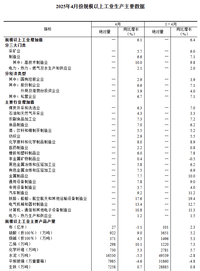 4月份,規(guī)模以上工業(yè)增加值同比實(shí)際增長(zhǎng)6.1%(增加值增速均為扣除價(jià)格因素的實(shí)際增長(zhǎng)率)。從環(huán)比看,4月份,規(guī)模以上工業(yè)增加值比上月增長(zhǎng)0.22%。1—4月份,規(guī)模以上工業(yè)增加值同比增長(zhǎng)6.4%。